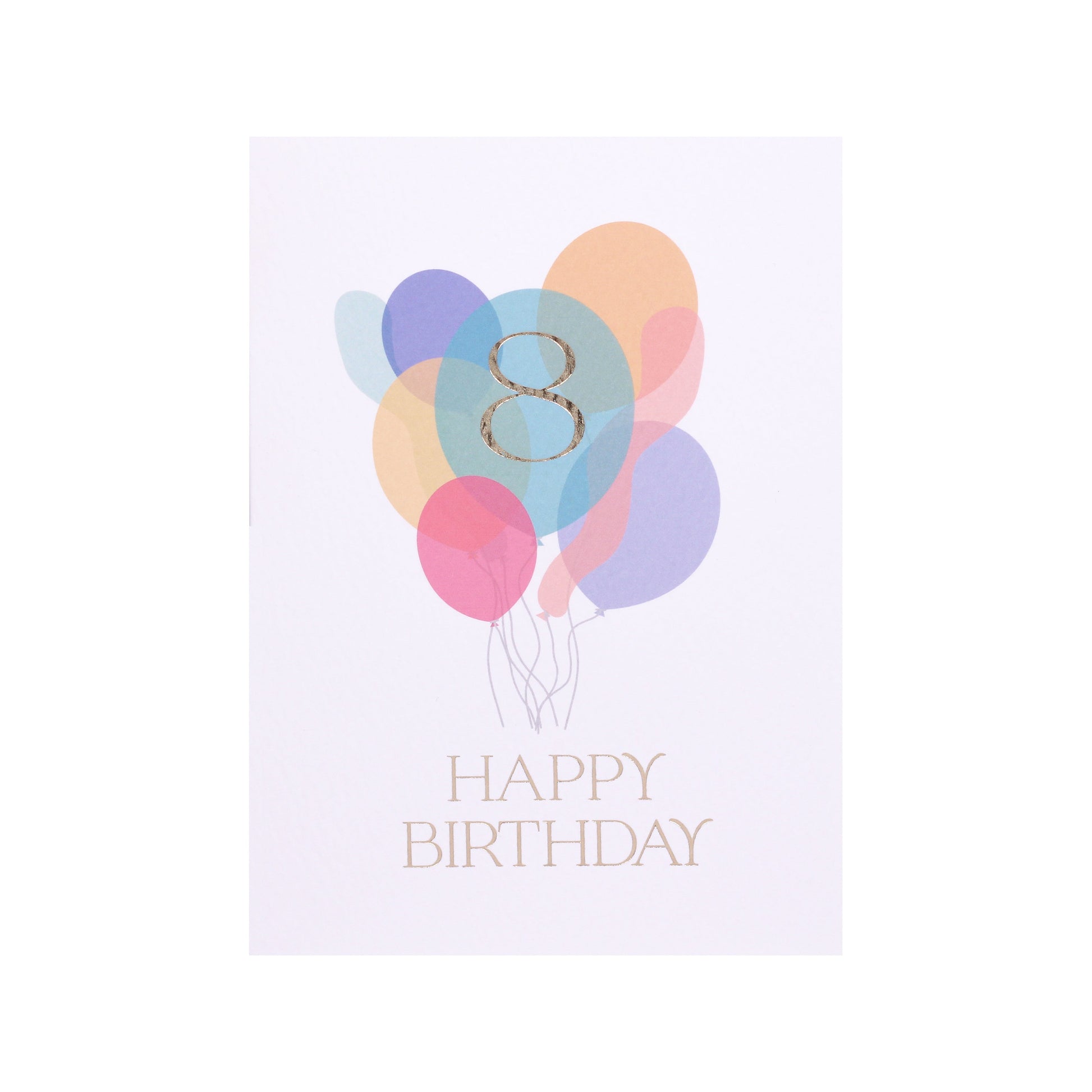 Luxury eighth birthday balloon greetings card, featuring an illustration of eight coloured balloons with the number 8 and the words ‘Happy Birthday' in gold foil. Each hot foil card has been printed individually on my traditional hot foil press in my Cambridgeshire Studio using premium uncoated card stock and luxurious foil. This greetings card is A6 in size and comes with a crisp white envelope with a tactile finish which oozes quality when it comes through the letterbox.