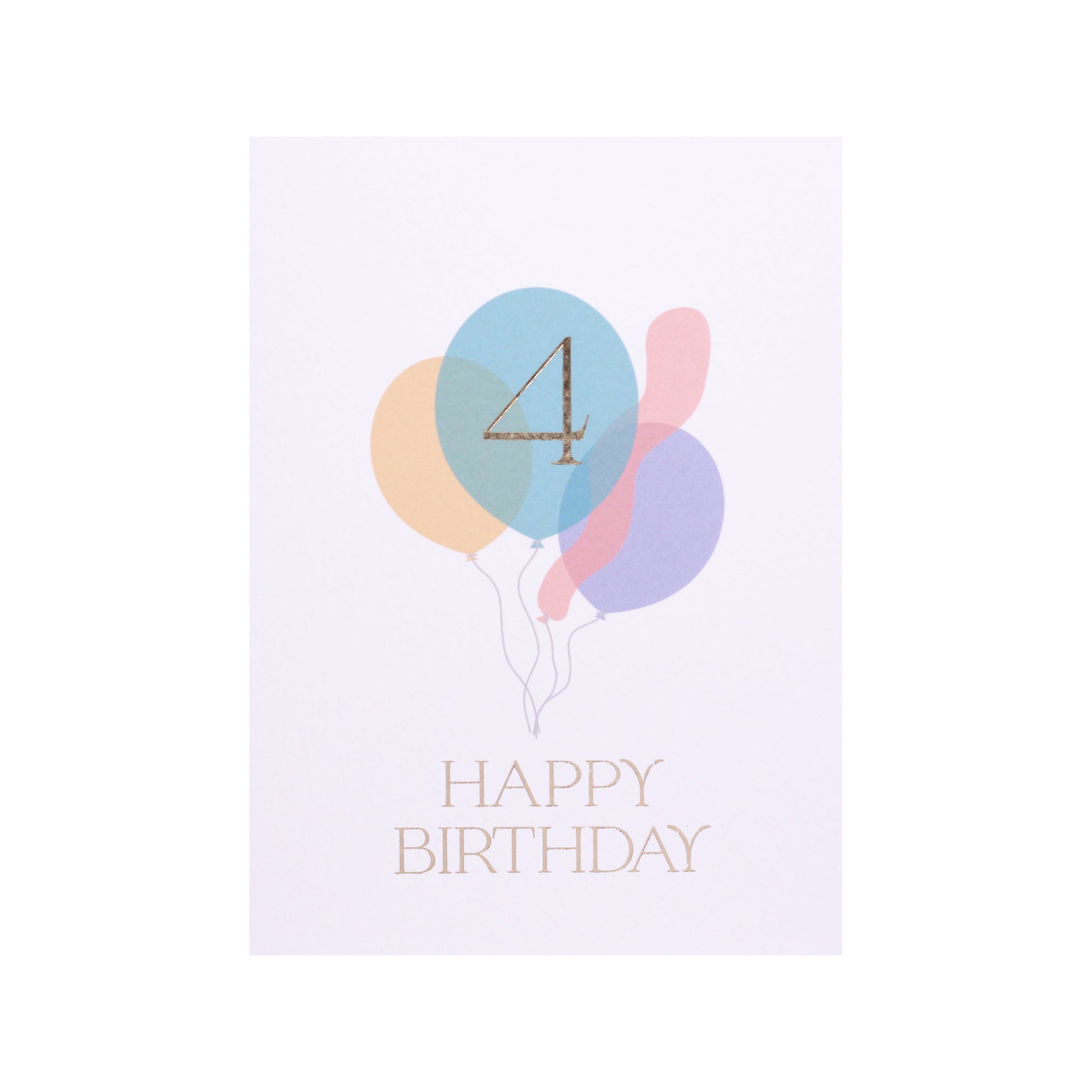 Luxury fourth birthday balloon greetings card, featuring an illustration of four coloured balloons with the number 4 and the words ‘Happy Birthday' in gold foil. Each hot foil card has been printed individually on my traditional hot foil press in my Cambridgeshire Studio using premium uncoated card stock and luxurious foil. This greetings card is A6 in size and comes with a crisp white envelope with a tactile finish which oozes quality when it comes through the letterbox.