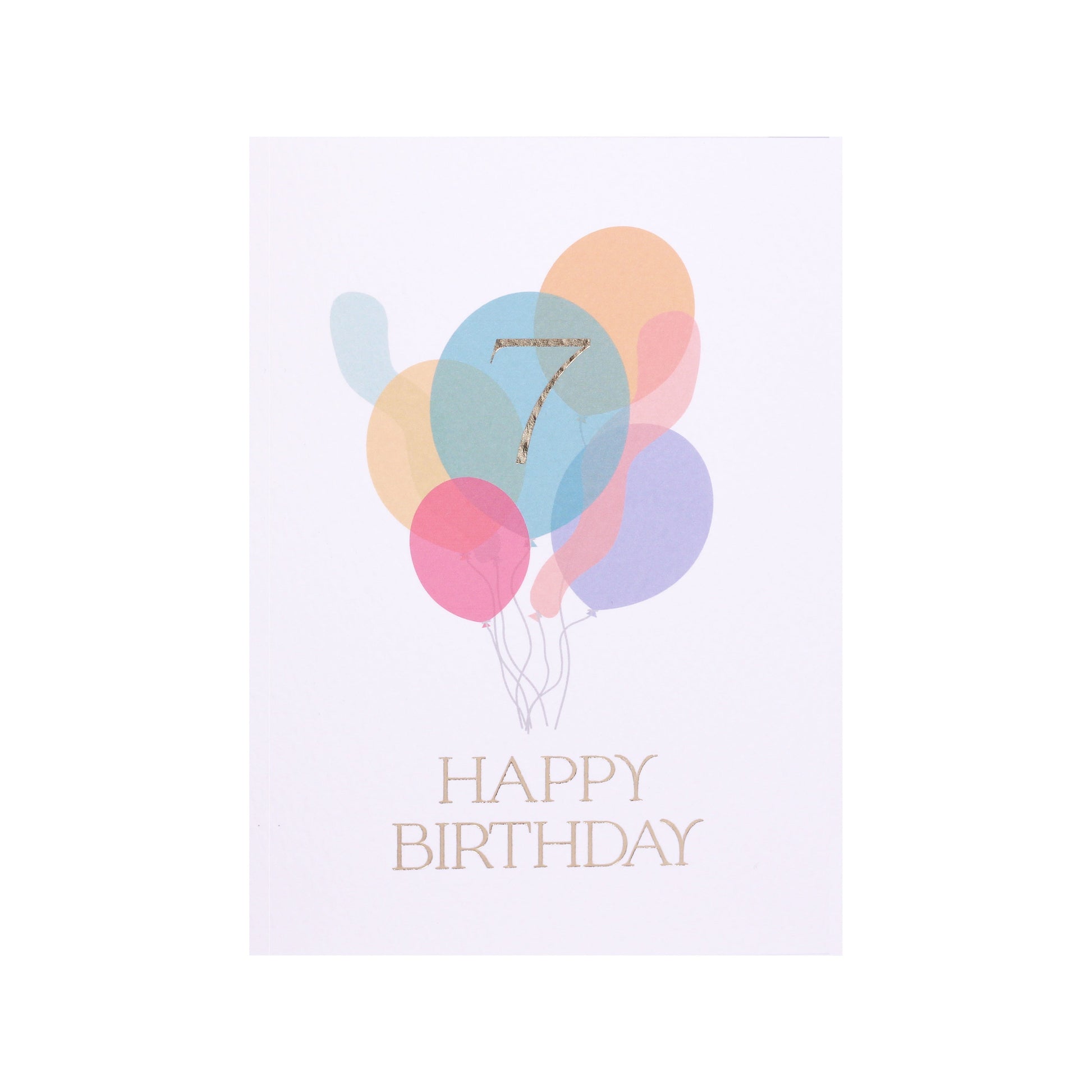 Luxury seventh birthday balloon greetings card, featuring an illustration of seven coloured balloons with the number 7 and the words ‘Happy Birthday' in gold foil. Each hot foil card has been printed individually on my traditional hot foil press in my Cambridgeshire Studio using premium uncoated card stock and luxurious foil. This greetings card is A6 in size and comes with a crisp white envelope with a tactile finish which oozes quality when it comes through the letterbox.
