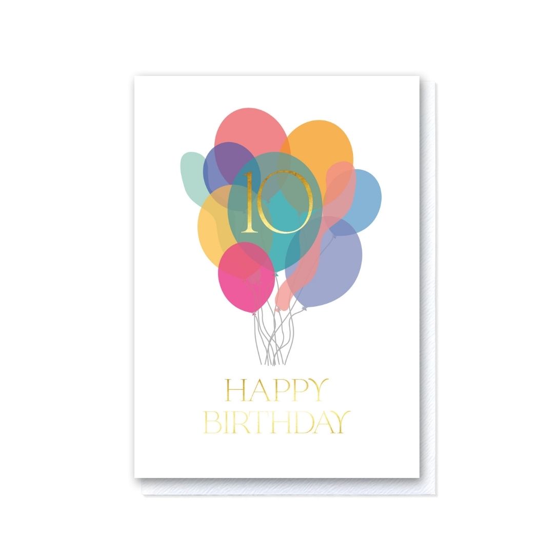 Luxury tenth birthday balloon greetings card, featuring an illustration of ten coloured balloons with the number 10 and the words ‘Happy Birthday' in gold foil. Each hot foil card has been printed individually on my traditional hot foil press in my Cambridgeshire Studio using premium uncoated card stock and luxurious foil. This greetings card is A6 in size and comes with a crisp white envelope with a tactile finish which oozes quality when it comes through the letterbox.