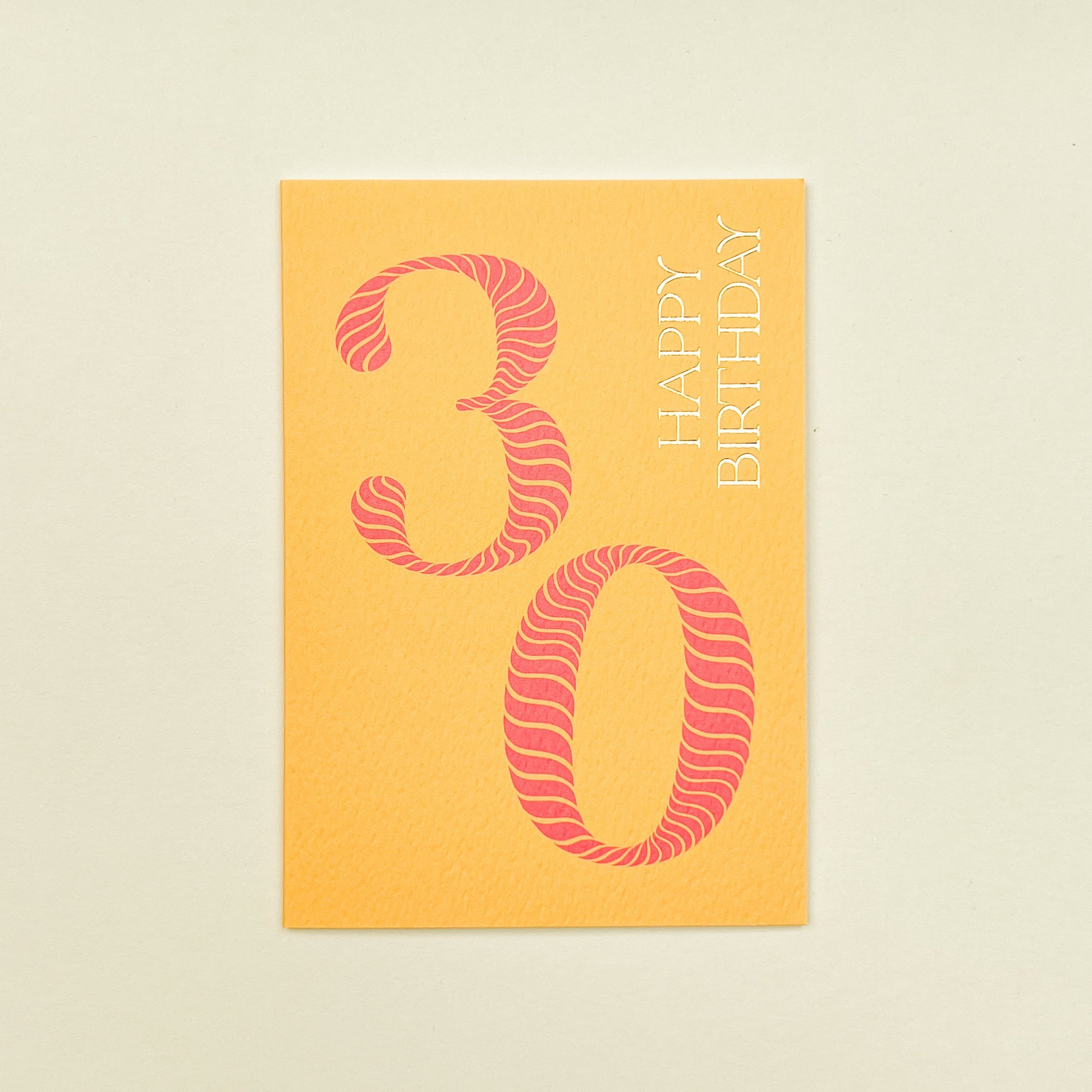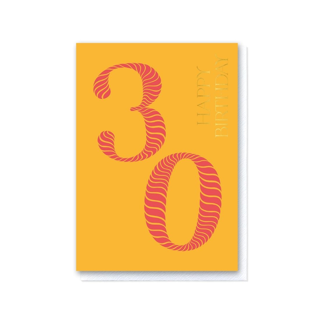 Celebrate a milestone birthday in style with our vibrant 'Birthday Stripes 30th Birthday' greeting card. Featuring a cheerful striped-number design adorned with gold foil typography, this card is the perfect way to commemorate reaching the age of thirty. Measuring 148x105mm, it includes a premium white envelope with a refined, tactile finish, delivering your warmest wishes with elegance.