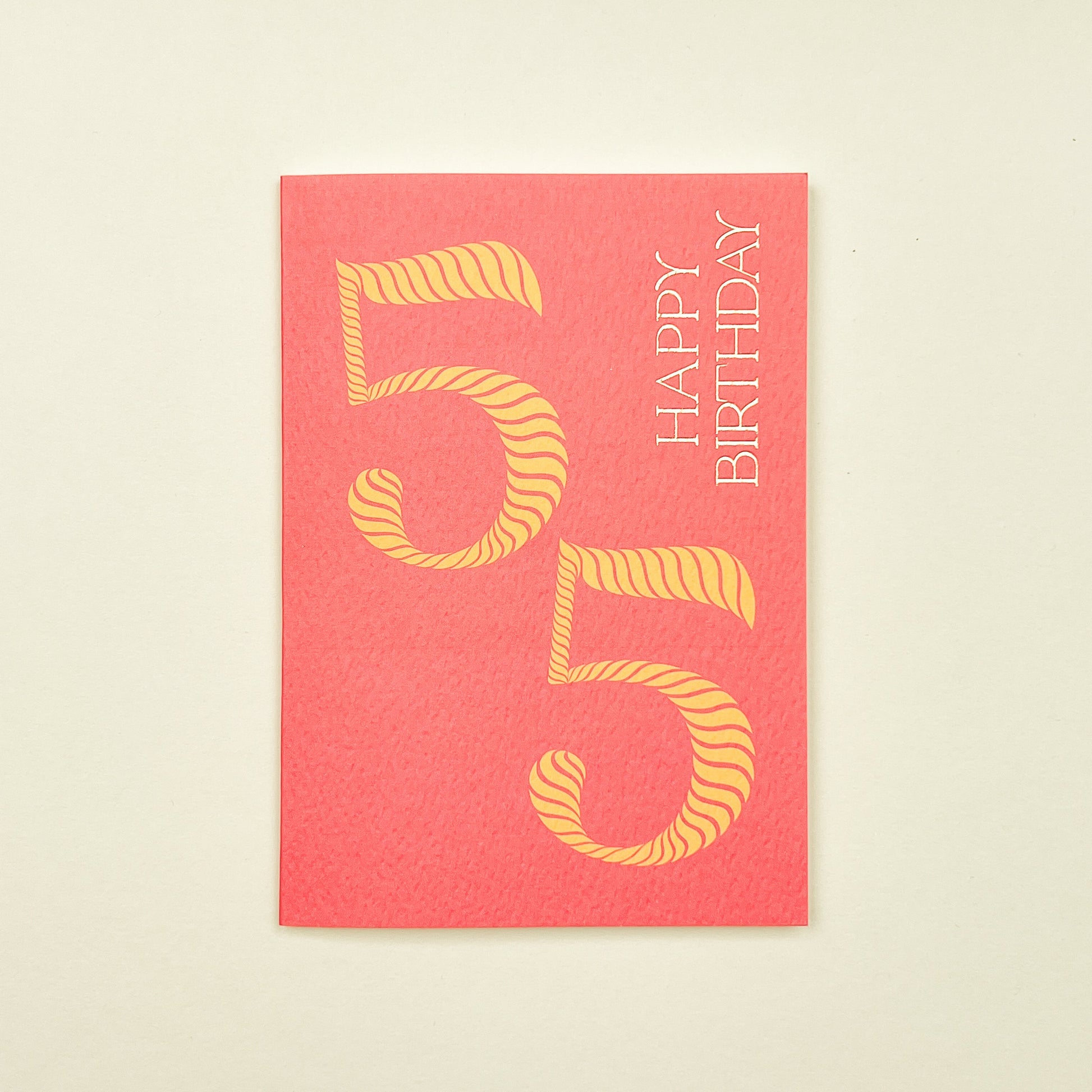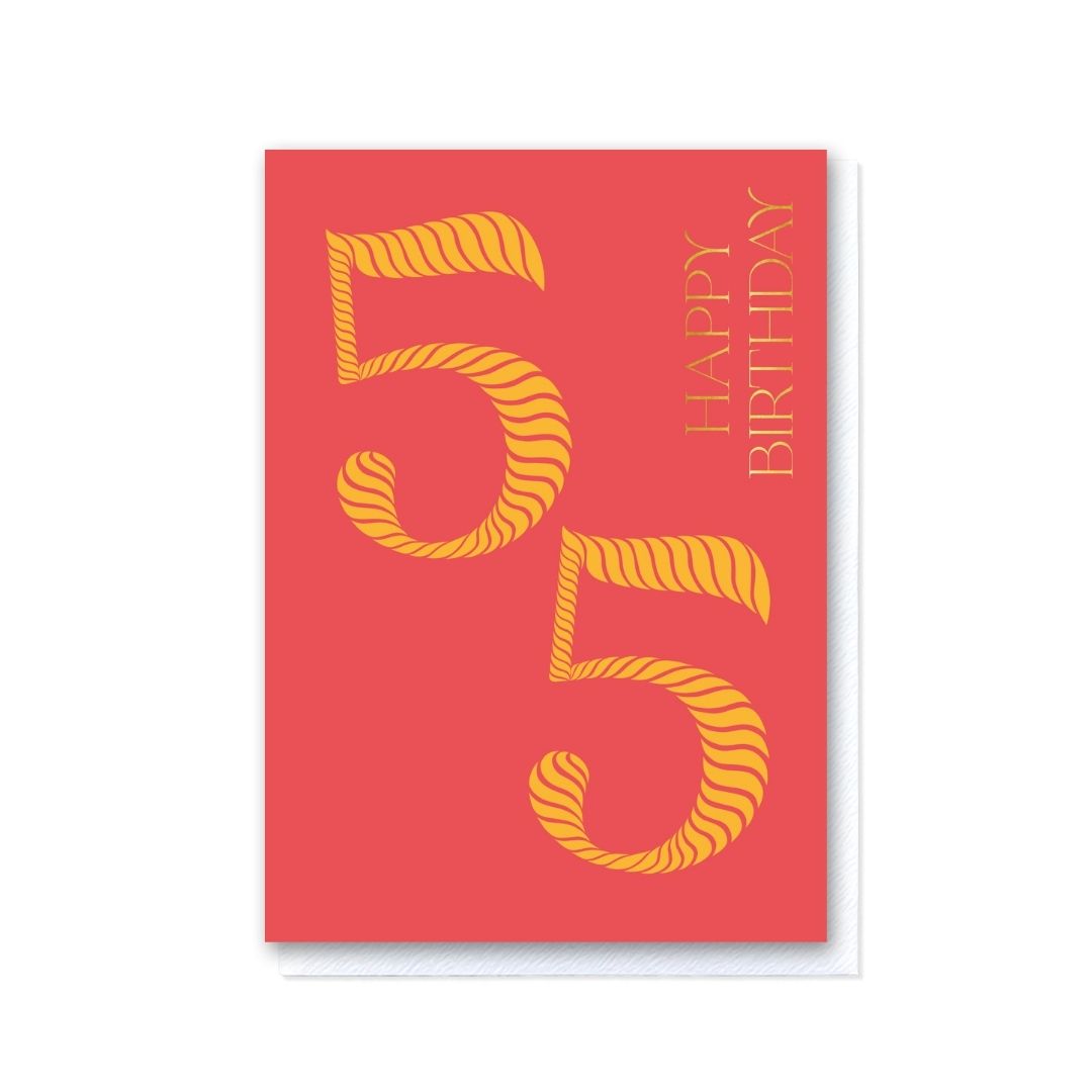 Celebrate a milestone birthday in style with our vibrant 'Birthday Stripes 55th Birthday' greeting card. Featuring a cheerful striped-number design adorned with gold foil typography, this card is the perfect way to commemorate reaching the age of fifty-five. Measuring 148x105mm, it includes a premium white envelope with a refined, tactile finish, delivering your warmest wishes with elegance.