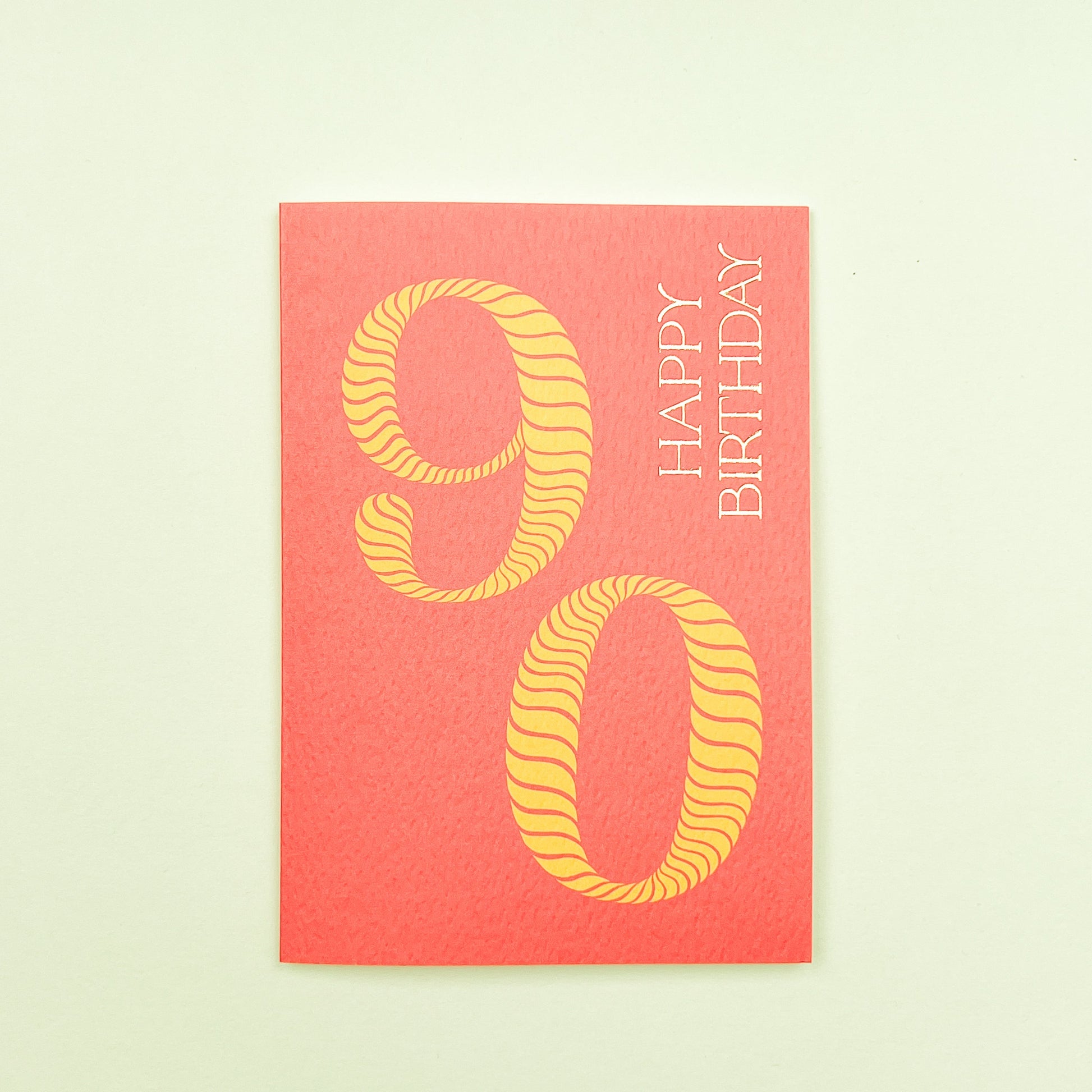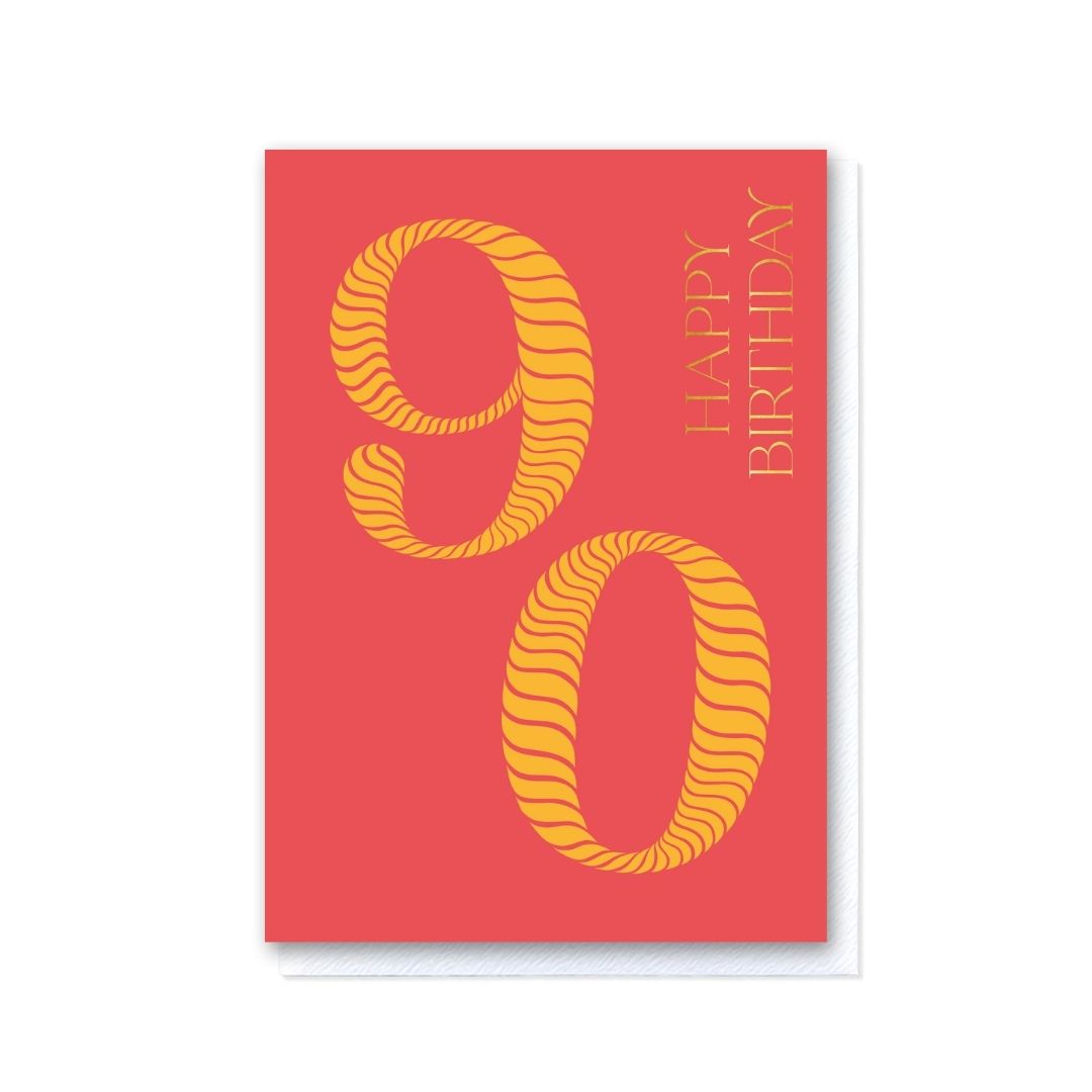 Celebrate a milestone birthday in style with our vibrant 'Birthday Stripes 90th Birthday' greeting card. Featuring a cheerful striped-number design adorned with gold foil typography, this card is the perfect way to commemorate reaching the age of ninety. Measuring 148x105mm, it includes a premium white envelope with a refined, tactile finish, delivering your warmest wishes with elegance.