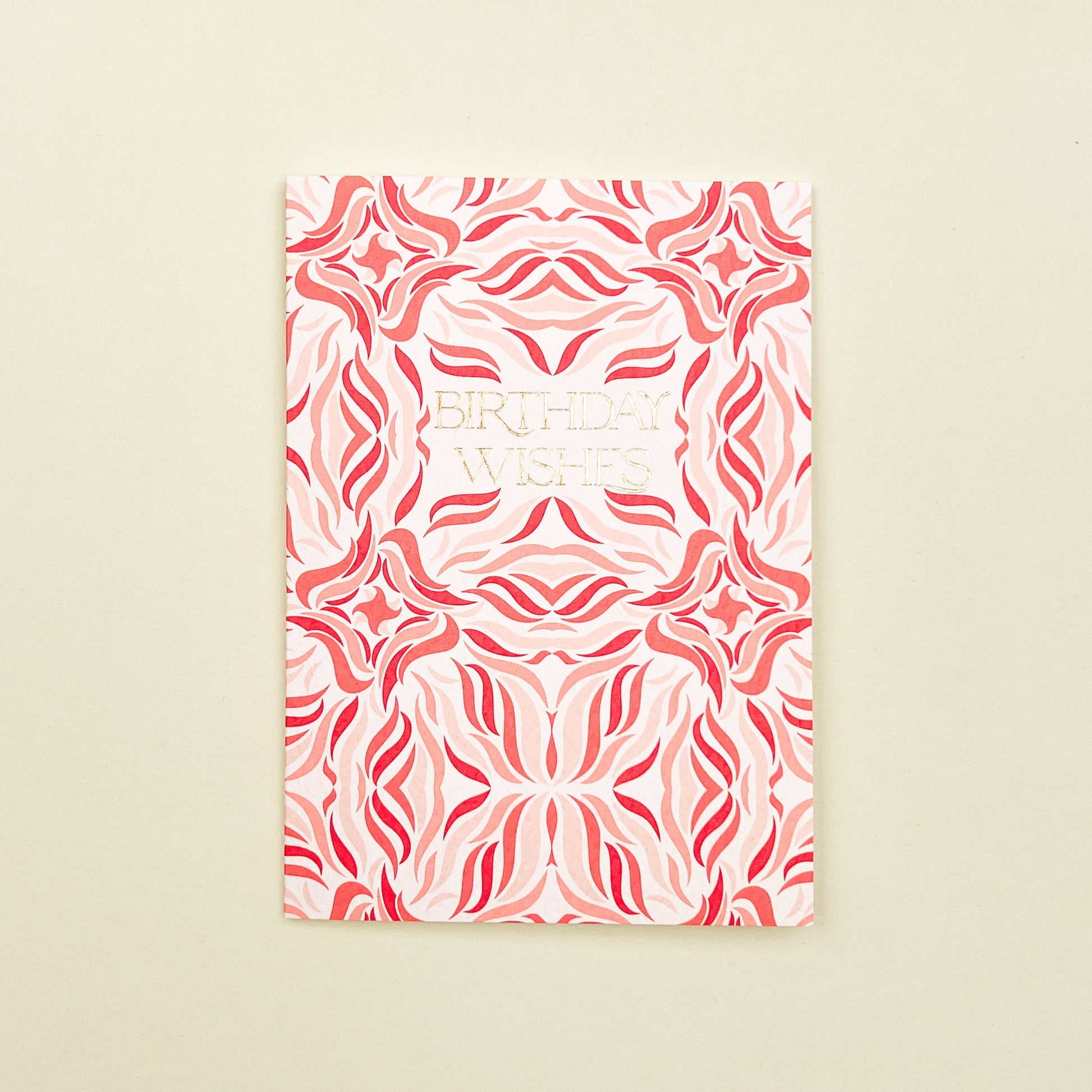 The Swishes range is stylish, elegant and intricate. This Birthday Wishes card is perfect for anyone who loves a bit of red & pink. Each hot foil card has been printed individually on my traditional hot foil press in my Cambridgeshire Studio using premium uncoated card stock and luxurious foil. This greetings card is A6 in size and comes with a crisp white envelope with a tactile finish which oozes quality when it comes through the letterbox.Printed onto a luxurious textured 300gsm white card which is Chlorine Free, FSC Certified and sustainably sourced, as well as being fully recyclable too. A6 in size (105 x 148mm | 4.1" x 5.8").Left blank inside for your own message.Proudly made and printed in the UK.