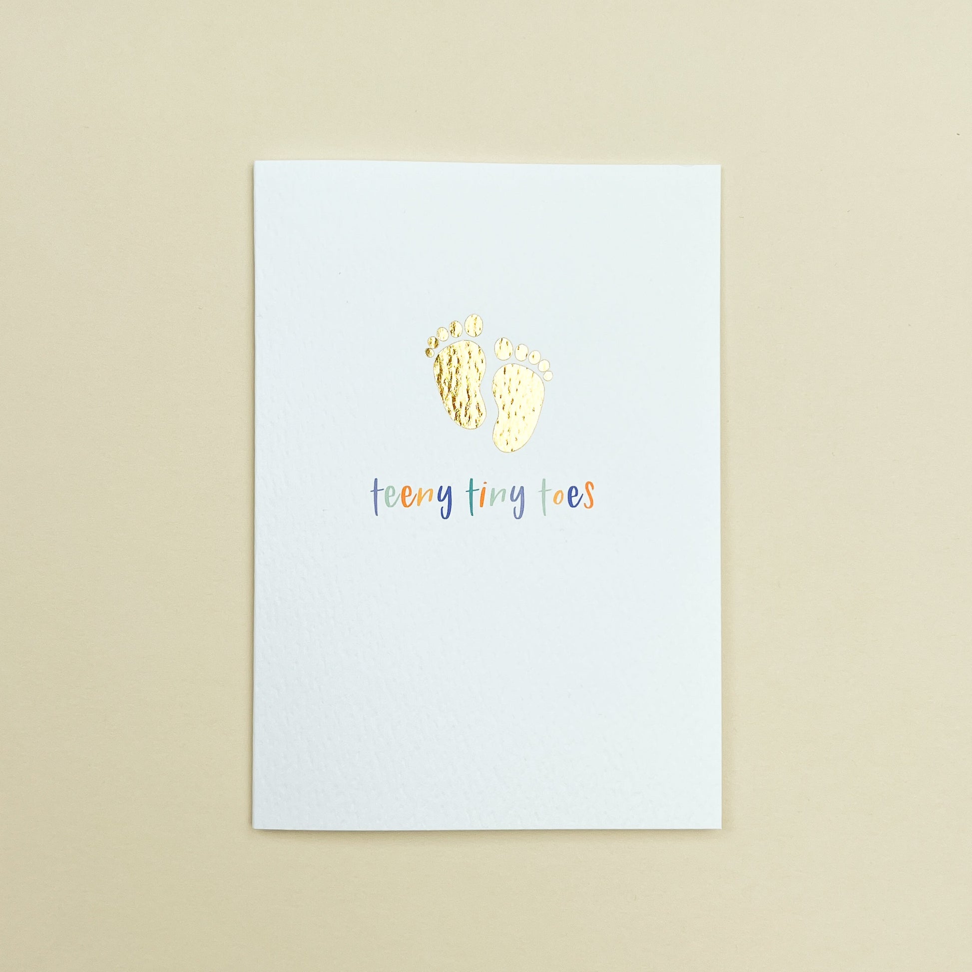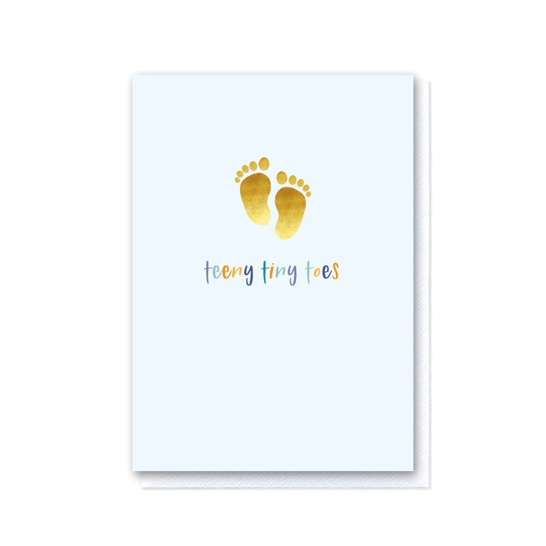 Celebrate the arrival of a precious little one with our 'Teeny Tiny Toes Blue' greeting card. Featuring a delightful gold foil little-feet design with a pale blue background. Measuring 148x105mm, it includes a premium white envelope with a refined, tactile finish that exudes elegance upon delivery.