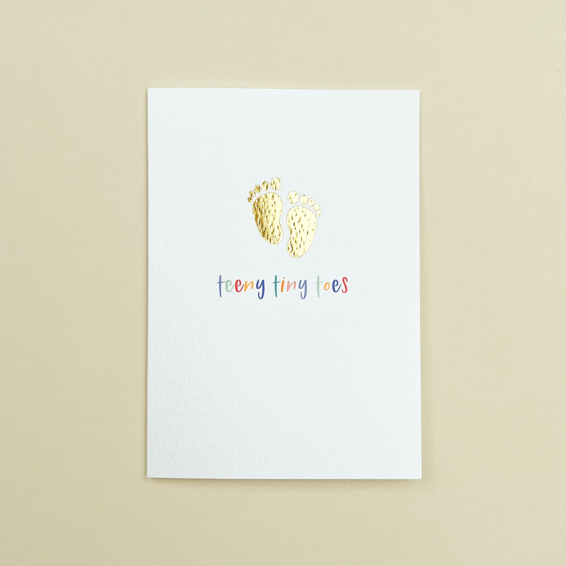 Celebrate the arrival of a precious little one with our 'Teeny Tiny Toes' greeting card. Featuring a delightful gold foil little-feet design with a multi-coloured sentiment on a white background. Measuring 148x105mm, it includes a premium white envelope with a refined, tactile finish that exudes elegance upon delivery.