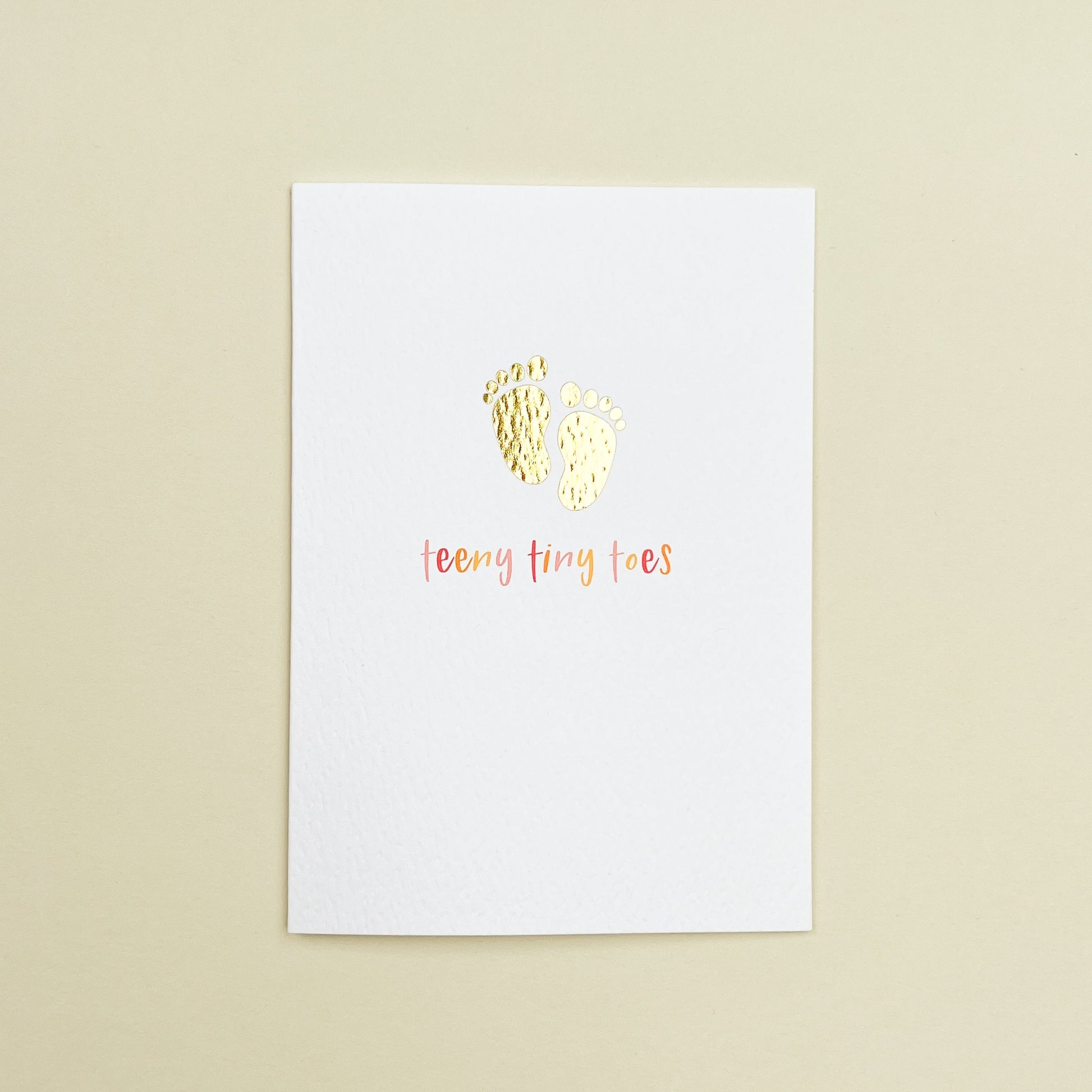 Celebrate the arrival of a precious little one with our 'Teeny Tiny Toes Pink' greeting card. Featuring a delightful gold foil little-feet design with a pale pink background. Measuring 148x105mm, it includes a premium white envelope with a refined, tactile finish that exudes elegance upon delivery.