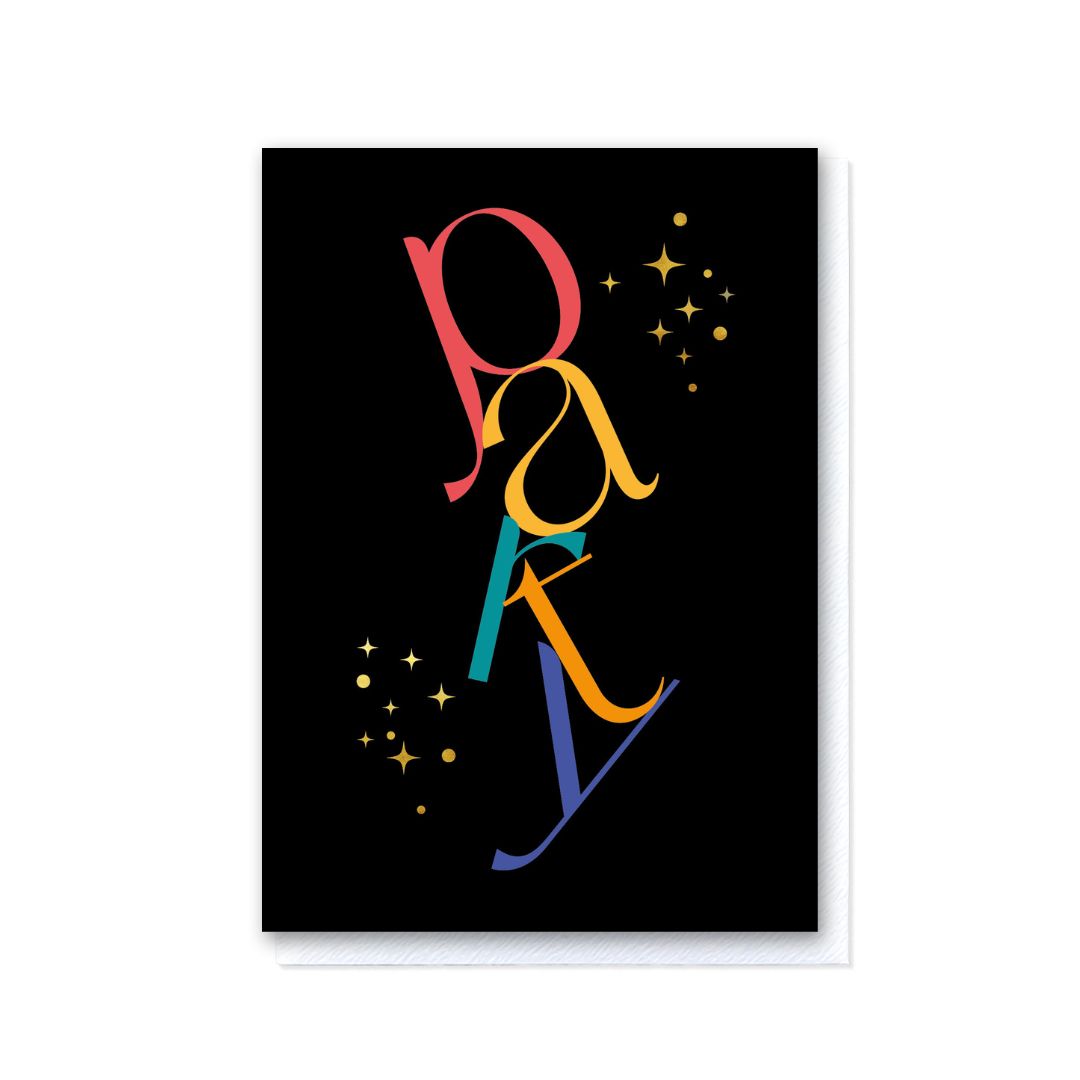 Celebrate a milestone in style with our bold and vibrant "Celebration Stacks - Party" greeting card. Part of the dazzling Celebration Stacks range, this card features striking multi-coloured typography cascading down a sleek black background, complemented by luxurious gold hot-foiled stars for an extra touch of sparkle.
