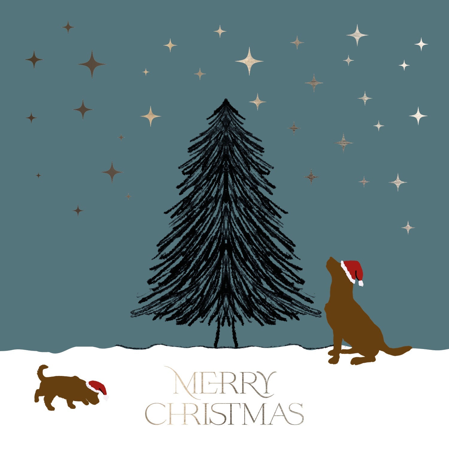 Share the joy of the season with our best selling 'Chocolate Labs in a Winter Wonderland' greeting card. This card depicts playful Chocolate Labradors enjoying a snowy day, rendered with beautiful silver foil detail and pastel colours. Measuring 130x130mm, it comes with a premium white envelope with a refined, tactile finish that exudes elegance upon delivery.