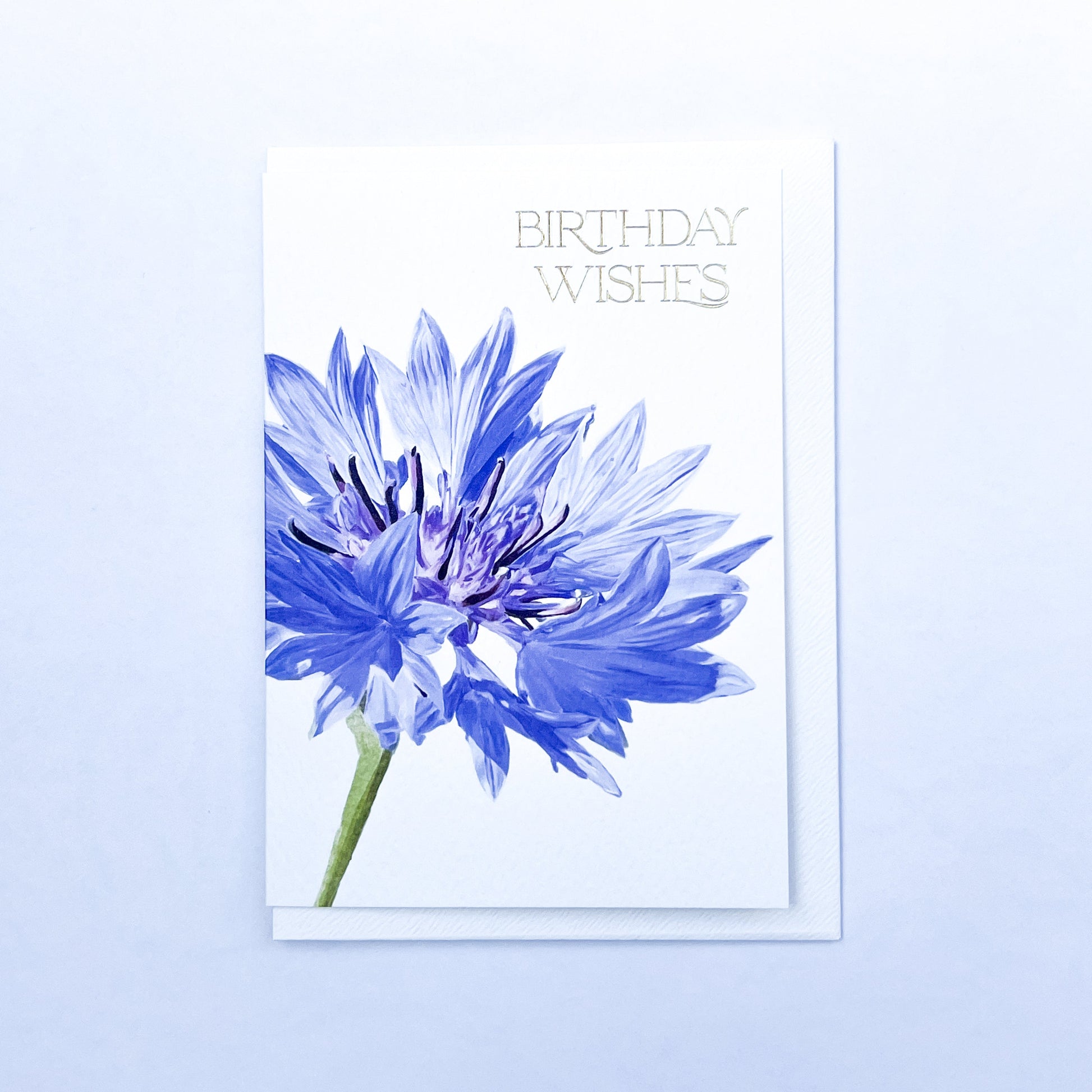 Send heartfelt birthday greetings with this exquisite card featuring a hand-drawn Cornflower illustration! Perfect for celebrating someone's special day, this card combines natural beauty with thoughtful sentiment. Each hot foil card is meticulously printed on my traditional hot foil press in my Cambridgeshire Studio using premium uncoated card stock and luxurious foil. This greetings card is A6 in size and comes with a crisp white envelope with a tactile finish, ensuring it arrives with elegance and charm.