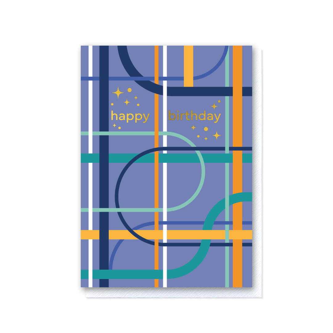 A contemporary birthday card featuring intersecting lines and shapes inspired by sports court markings. Set on a soft lilac background and finished with gold foil “Happy Birthday” lettering and star details.