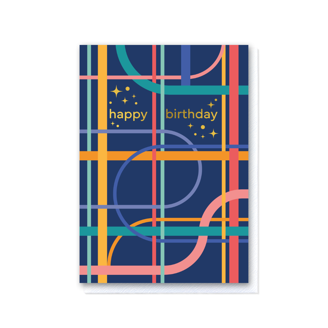 A modern birthday card featuring layered linear markings inspired by gymnasium floor patterns. Set on a deep navy background and finished with gold foil “Happy Birthday” lettering and star accents, this design feels bold and refined.