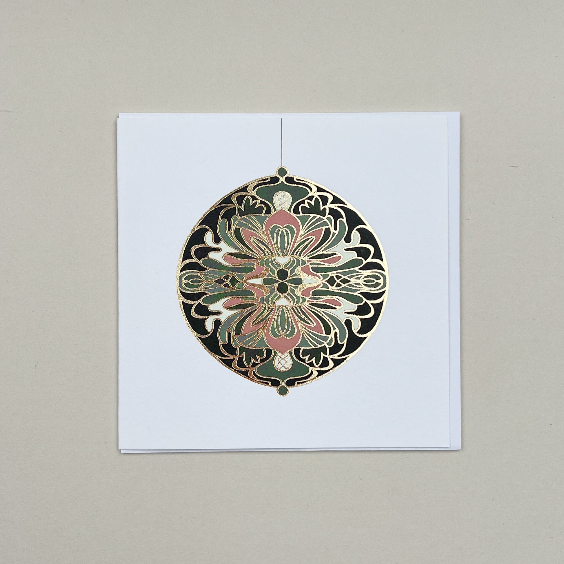 Inspired by childhood memories of enamel brooches and mirror compacts in my mother's jewellery box, these foiled baubles are all about nostalgia, intricate details all accentuated by gold foil. This greetings card is 130x130mm in size and comes with a crisp white envelope with a tactile finish which oozes quality when it comes through the letterbox. Printed onto a luxurious textured 300gsm white card which is FSC Certified and sustainably sourced, as well as being fully recyclable too. Left blank inside for your own message. Proudly made and printed in the UK.