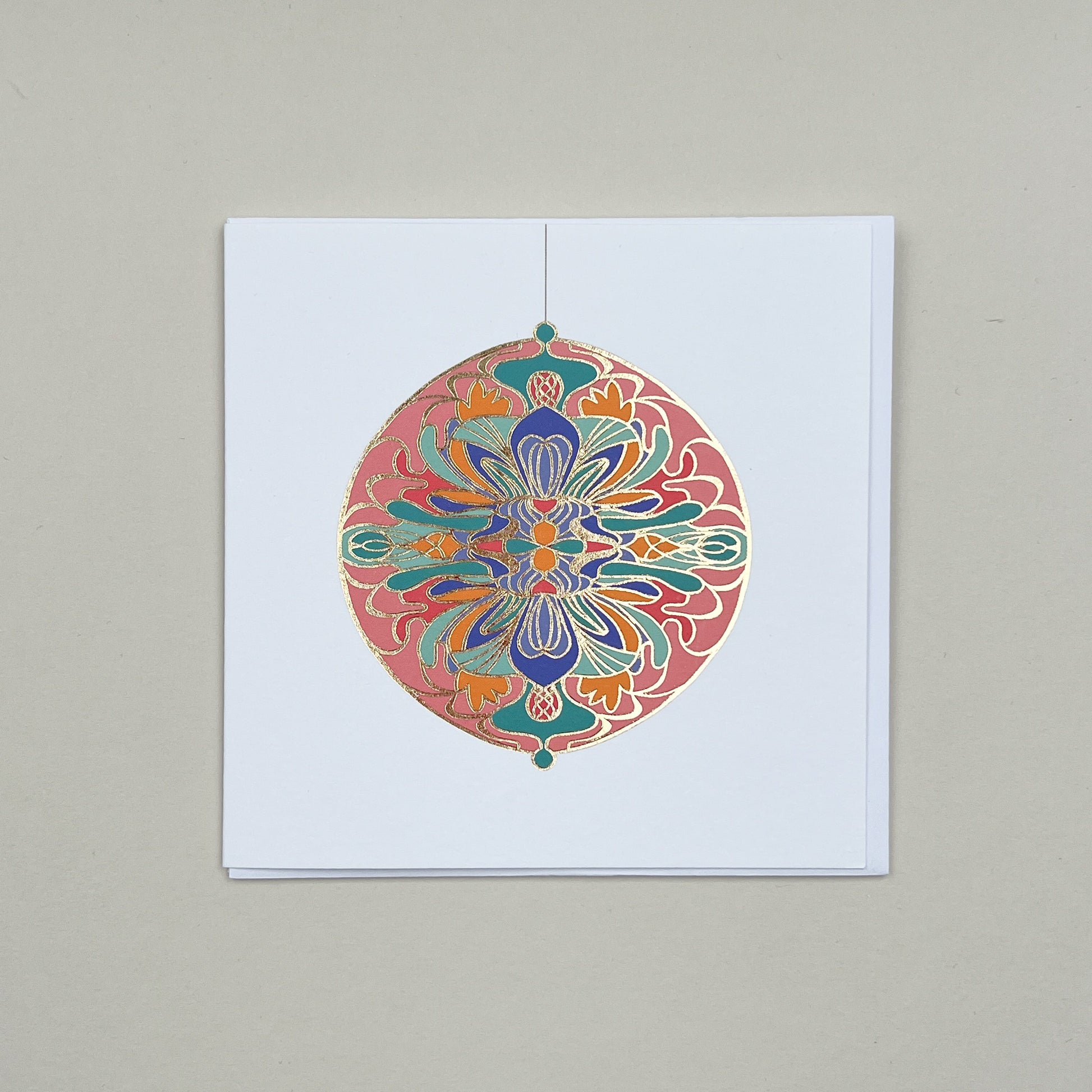Inspired by childhood memories of enamel brooches and mirror compacts in my mother's jewellery box, these foiled baubles are all about nostalgia, intricate details all accentuated by gold foil. This greetings card is 130x130mm in size and comes with a crisp white envelope with a tactile finish which oozes quality when it comes through the letterbox. Printed onto a luxurious textured 300gsm white card which is FSC Certified and sustainably sourced, as well as being fully recyclable too. Left blank inside for your own message. Proudly made and printed in the UK.