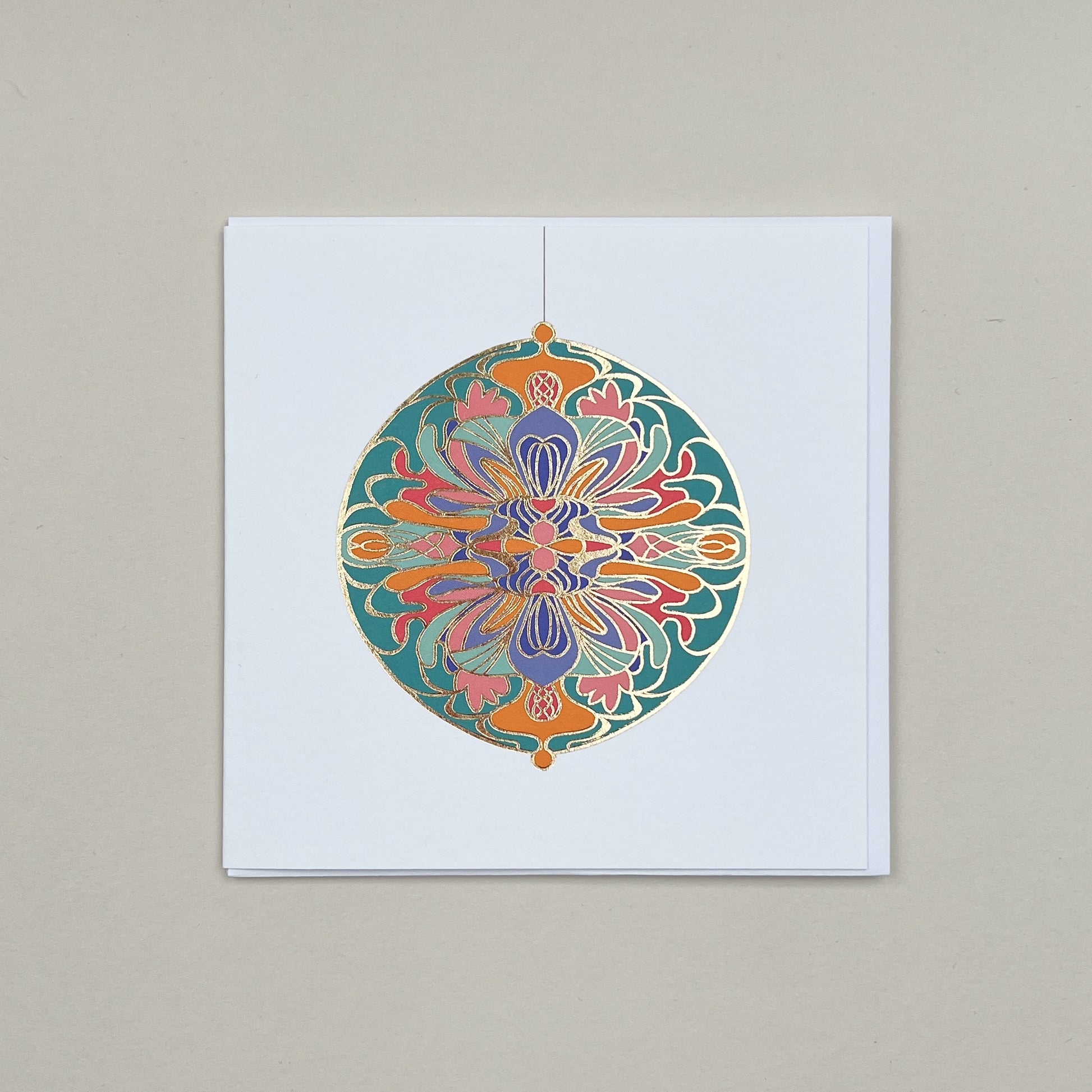 Inspired by childhood memories of enamel brooches and mirror compacts in my mother's jewellery box, these foiled baubles are all about nostalgia, intricate details all accentuated by gold foil. This greetings card is 130x130mm in size and comes with a crisp white envelope with a tactile finish which oozes quality when it comes through the letterbox. Printed onto a luxurious textured 300gsm white card which is FSC Certified and sustainably sourced, as well as being fully recyclable too. Left blank inside for your own message. Proudly made and printed in the UK.