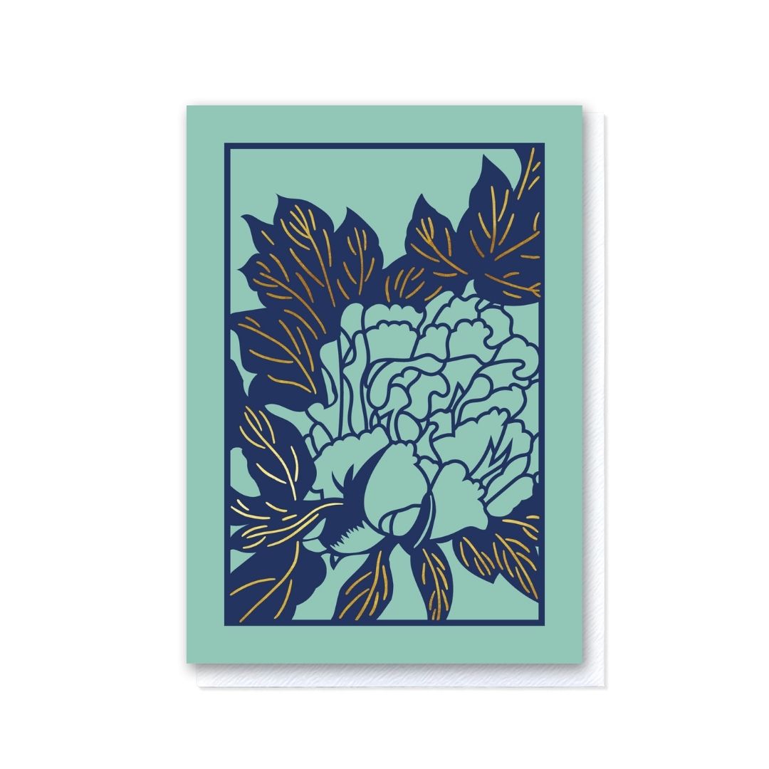 Express your sentiments with this elegant card featuring oriental-style peonies in navy blue outlines, highlighted with luxurious gold foil details. Set against a serene duck egg background, this card is perfect for any heartfelt message. Each hot foil card is delicately printed on my traditional hot foil press in my Cambridgeshire Studio using premium uncoated card stock and luxurious foil. The card is A6 in size and comes with a crisp white envelope with a tactile finish, adding a touch of sophistication.