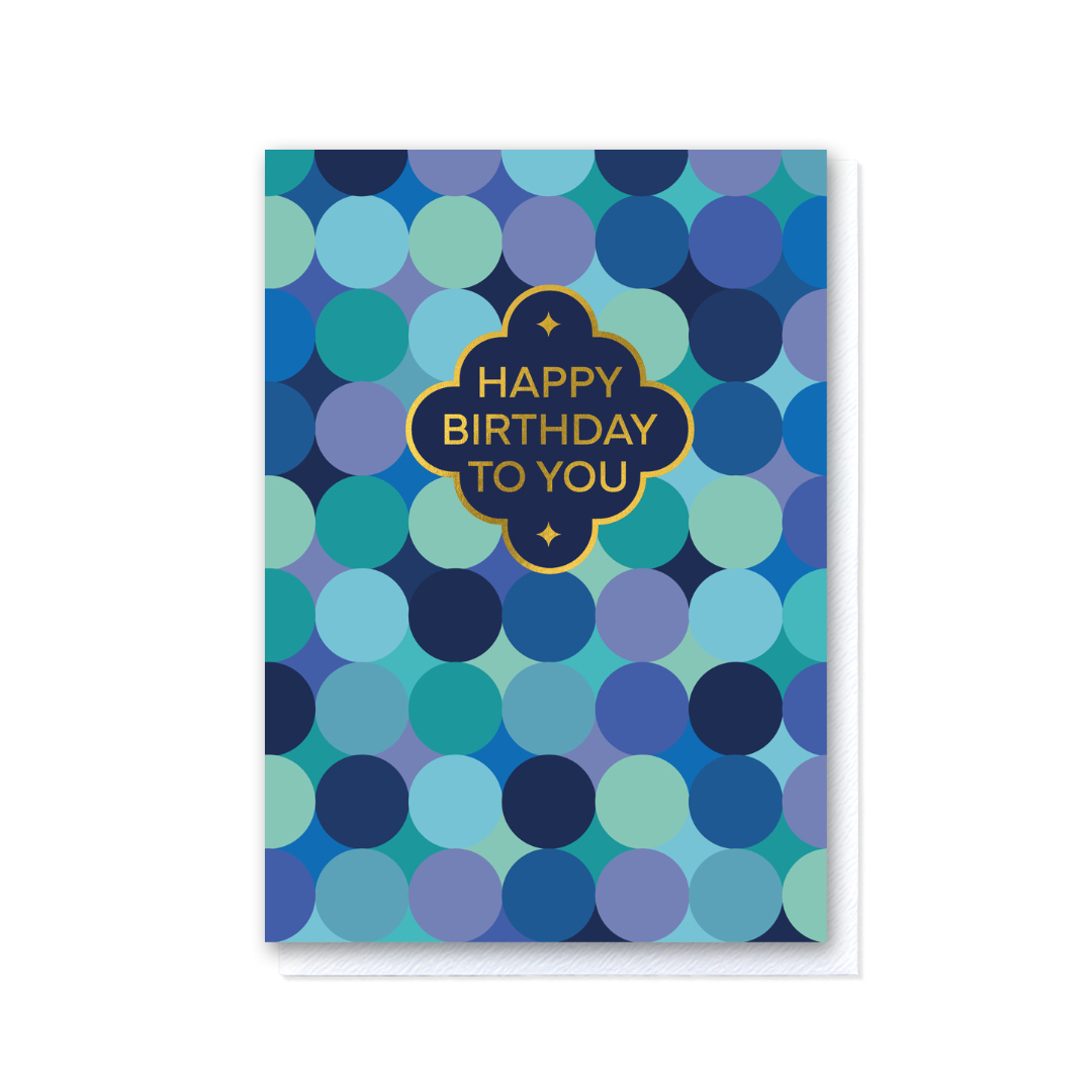 A clean, modern birthday card featuring overlapping circles in layered blues and teals. The cool-toned palette is paired with hot foil “Happy Birthday to You” lettering, offering a contemporary design with broad appeal.
