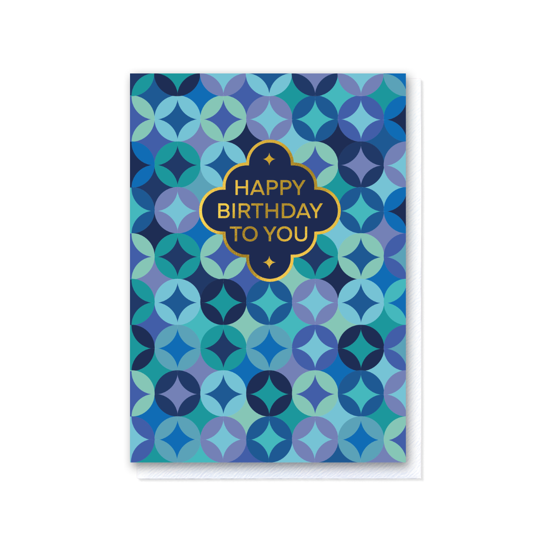 A contemporary birthday card featuring layered circles and diamond shapes in tonal blues and teals. Hot foil “Happy Birthday to You” lettering adds a refined celebratory detail to the calm, graphic design.