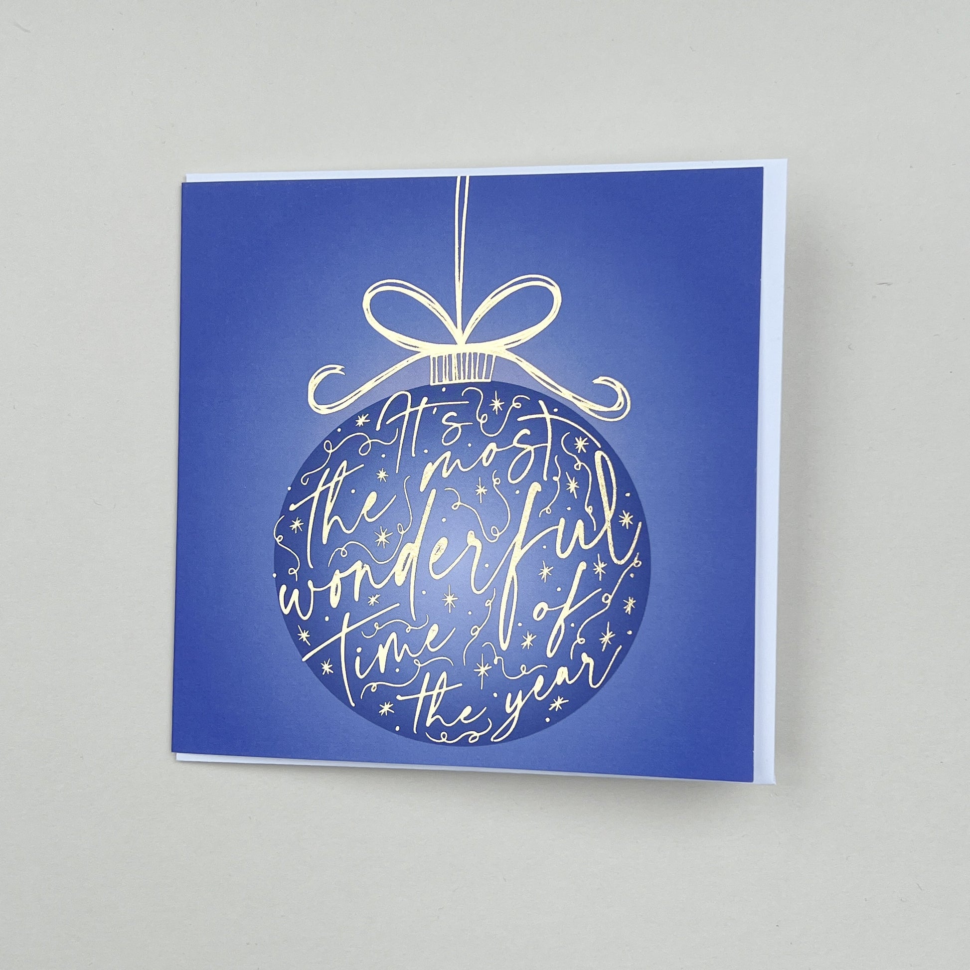 Celebrate the festive spirit with our 'Most Wonderful Time of the Year Blue Bauble' greeting card. This elegant card features a beautifully illustrated typographic teal bauble adorned with intricate gold foil designs, perfectly capturing the essence of the holiday season. Measuring 130x130mm, it comes with a premium white envelope with a refined, tactile finish that exudes elegance upon delivery.
