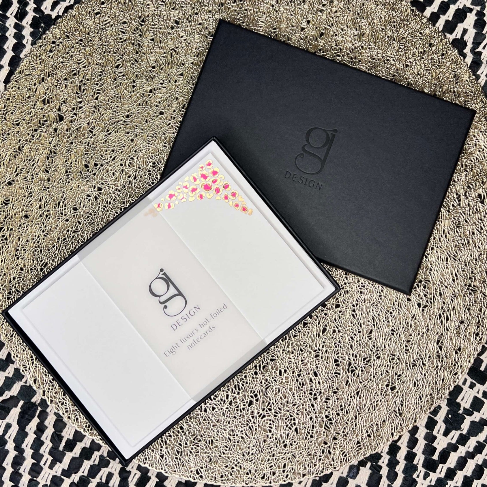 You'll think up any reason to send these stylish notecards. Each card is individually hand-finished with two foil colours on a traditional hot foil press. These hot foil cards are completely recyclable too! Available in four other colours.