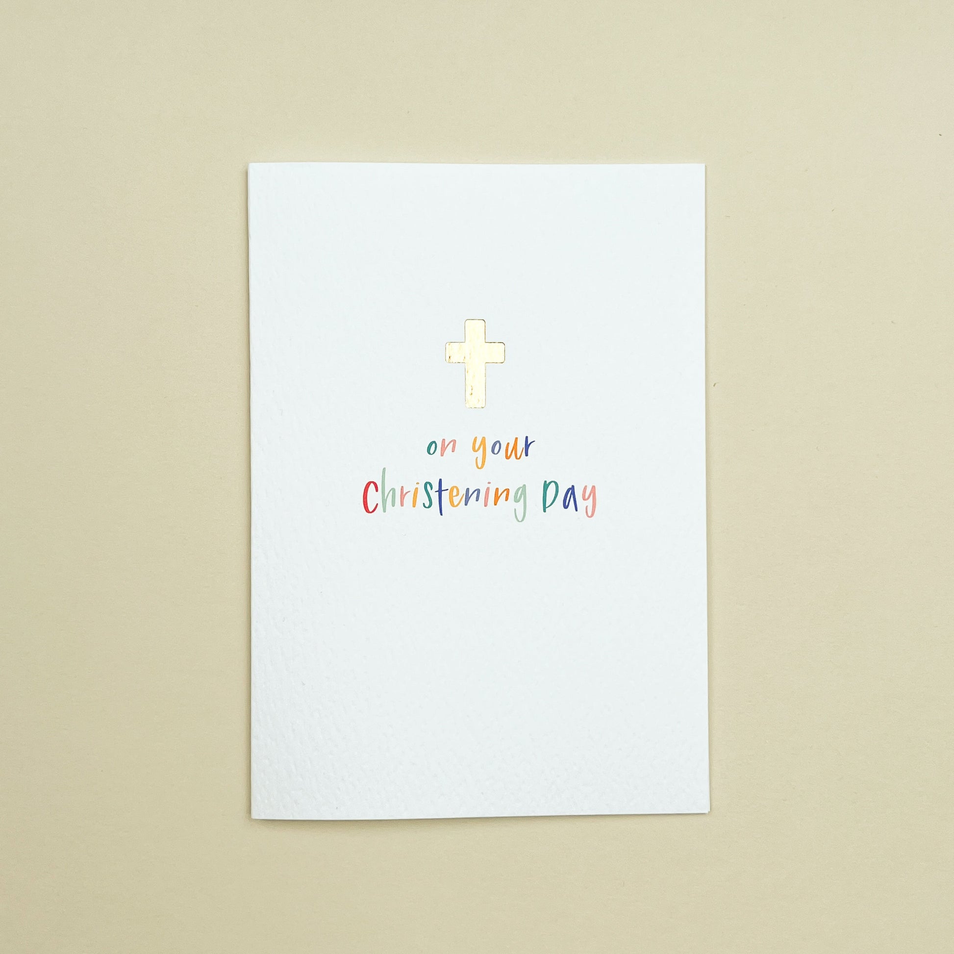 Mark a special occasion with our 'On Your Christening Day' greeting card. Featuring a beautiful and elegant multi-coloured design with a gold foil cross, this card is perfect for celebrating a christening. Measuring 148x105mm, it comes with a premium white envelope with a refined, tactile finish that exudes elegance upon delivery.