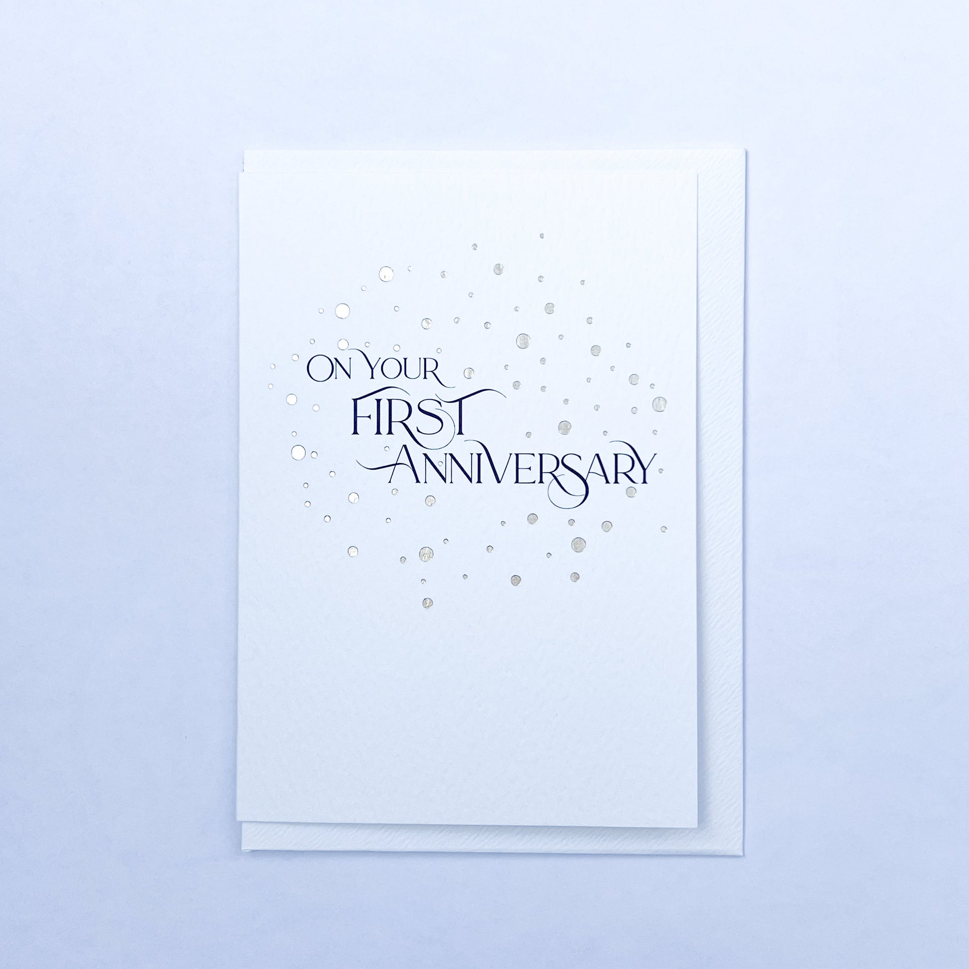 Celebrate their 1st wedding anniversary with this elegant typographic card adorned with delicate gold sparkles! From the joy of their wedding day to the beginning of their beautiful journey together, let this card commemorate their special milestone. Each hot foil card is meticulously printed on my traditional hot foil press in my Cambridgeshire Studio using premium uncoated card stock and luxurious foil. This greetings card is A6 in size and comes with a crisp white envelope with a tactile finish, exuding quality from the moment it arrives.