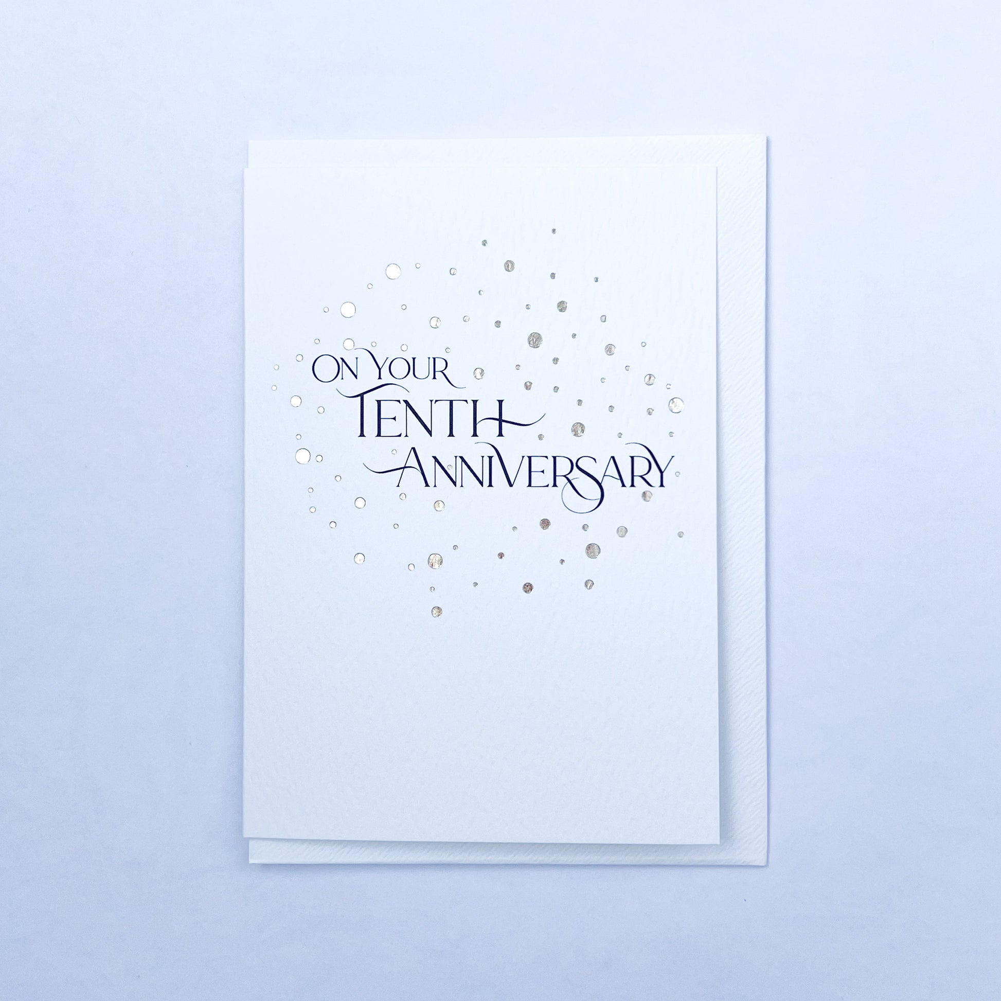 Celebrate their 10th wedding anniversary with this magnificent typographic card, embellished with platinum sparkles! From a decade of shared joys and triumphs to a future filled with promise, let this card commemorate their special day. Each hot foil card is precisely printed on my traditional hot foil press in my Cambridgeshire Studio using premium uncoated card stock and luxurious foil. This greetings card is A6 in size and comes with a crisp white envelope with a tactile finish, reflecting its superior craftsmanship.