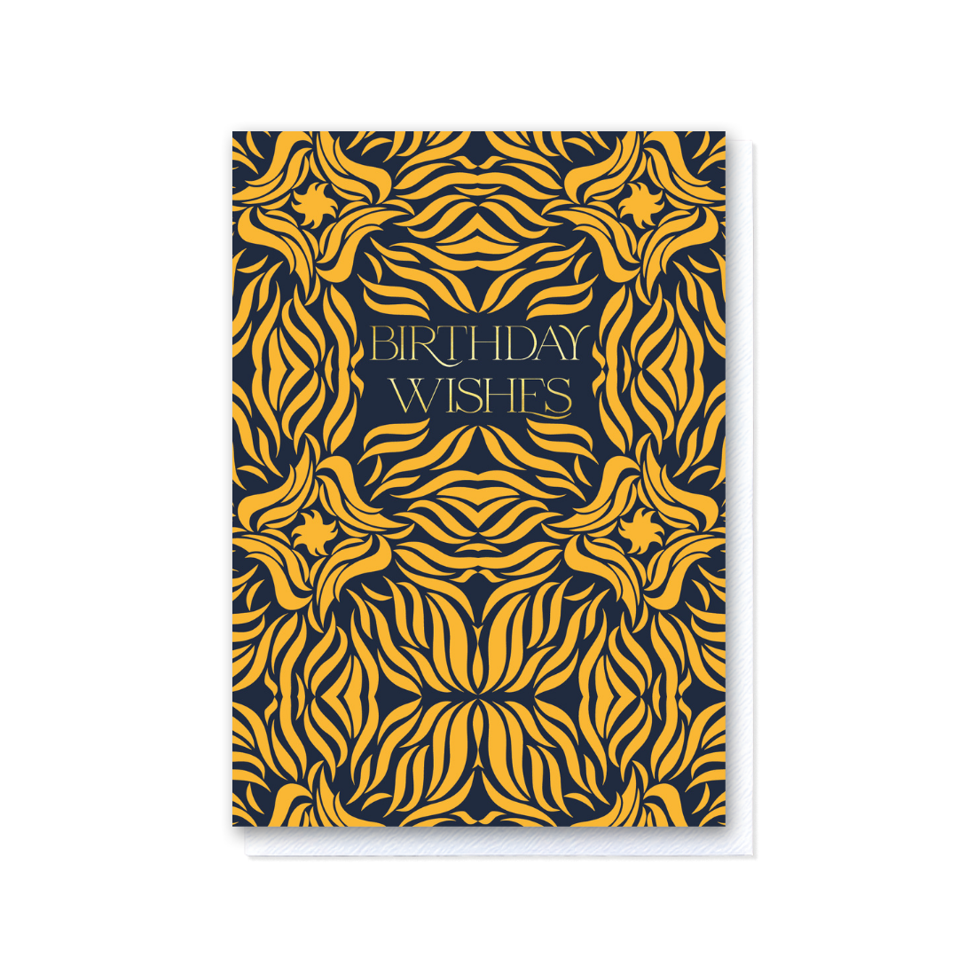 Mustard swirls on a deep backdrop make this card a unique and modern way to say Happy Birthday.
